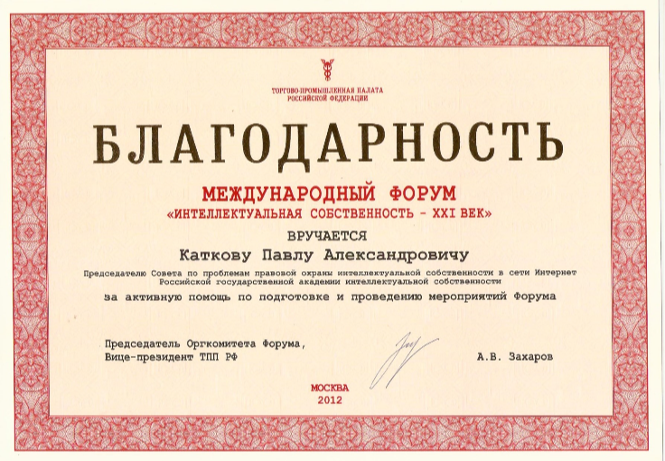 Отмечен благодарностью Торгово-промышленной палаты Российской Федерации за работу в качестве Председателя Совета по проблемам правовой охраны интеллектуальной собственности в сети Интернет Российской государственной академии интеллектуальной собственности при Роспатенте.