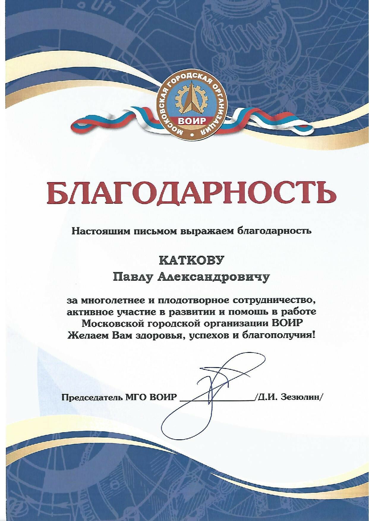 За вклад в развитие охраны и защиты интеллектуальной собственности отмечен благодарностью Всероссийского общества изобретателей и рационализаторов (ВОИР) - старейшего отечественного объединения инноваторов, история которого насчитывает более полувека.